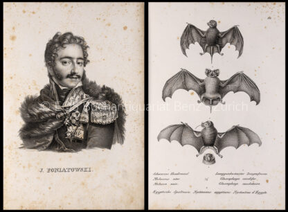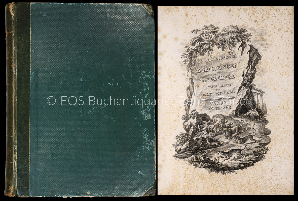 Schinz, H(einrich) Rudolf): Naturgeschichte und Abbidlungen der Säugethiere. Nach den neuesten Systemen zum gemeinnützigen Gebrauche entworfen, und mit Berücksichtigung für den Unterreicht der Jugend bearbeitet. Zürich, Bronftmann’s lithogr. Kunstanstalt, 1827. 2. verbesserte Auflage. 2 Bände. 4°. IV, 349 S., 4 Bl. (Textband); Titel, 24 unn. Tafeln mit Menschendarstellungen, 144 num. Tafeln mit Tierdarstellungen, lithographiert von Karl Brodtmann. Grünes Halbmaroquin d. Zt. mit goldgepr. Rückentiteln, Goldschnitt.
