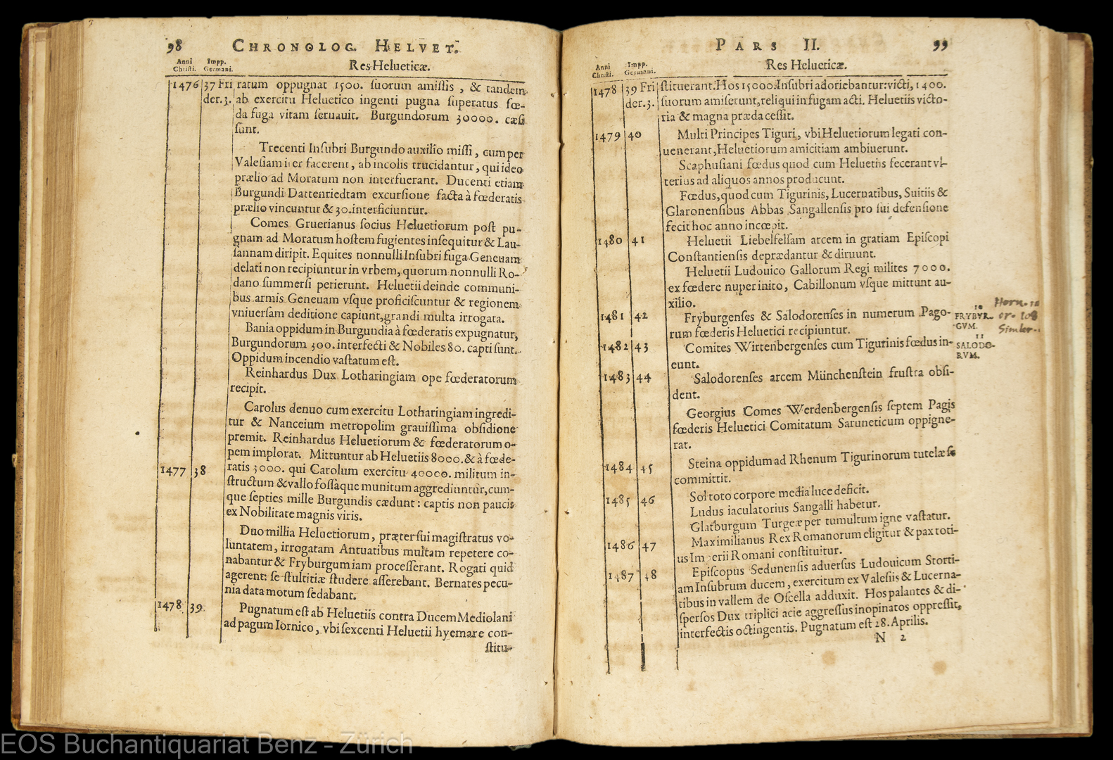 Schweizer, Johann Heinrich: Chronologia Helvetica. Res gestas Helvetiorum ad nostra usque tempora indicans ordine, & brevissime complectens; Adiuncta Summorum Pontificum, Imperatorum, Regum & Principum in orbe Christiano, nec non & Turcicorum Imperatorum successione & serie succincta. Hanau, Andreas Wechel Erben, 1607. Kl.-4°. (4) Bl., 166 S., (8) Bl. (Register und Druckervignette). Etwas späterer Halblederband.