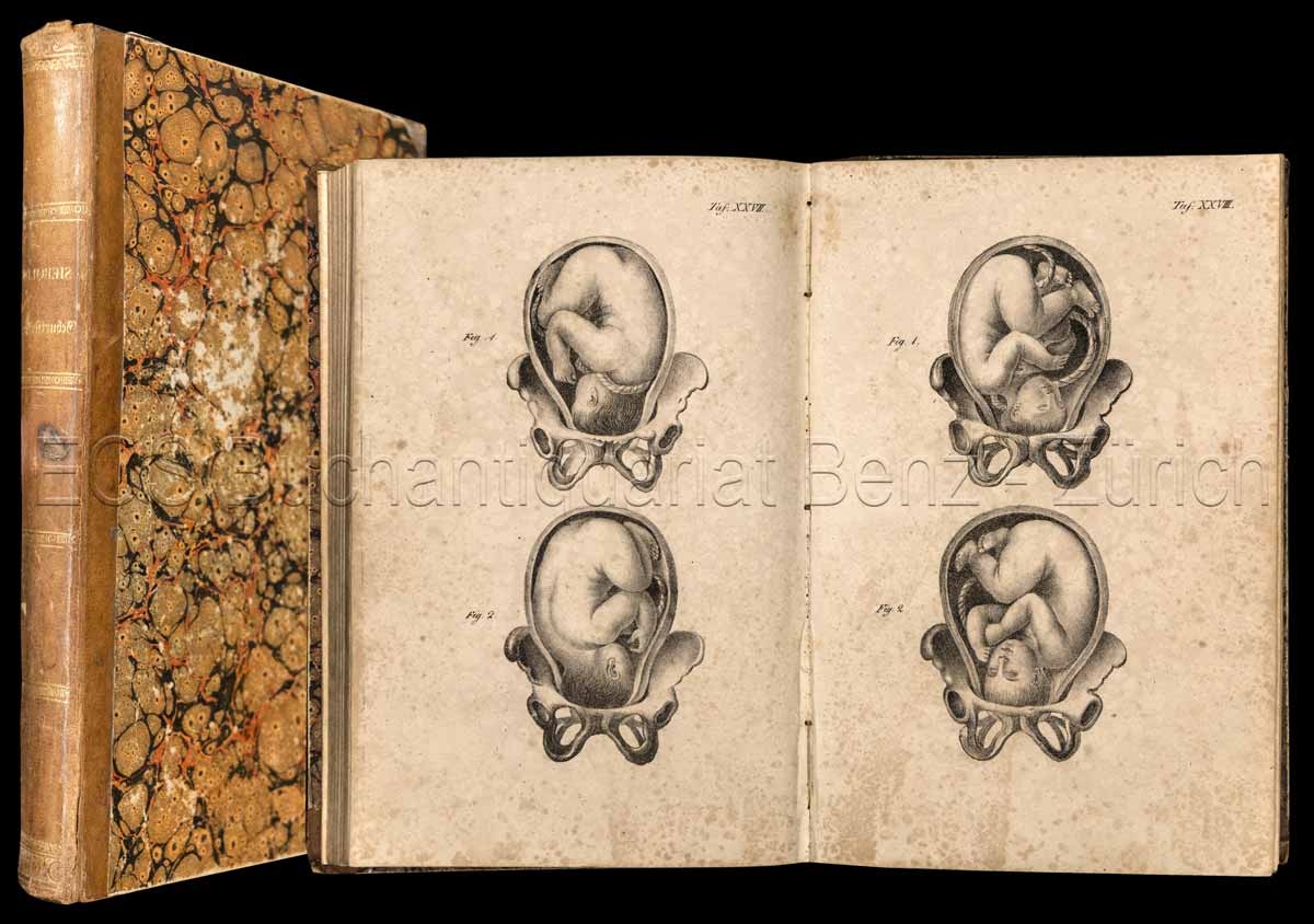 Siebold, Eduard Kaspar Jakob von: Abbildungen aus dem Gesammtgebiete der theoretisch-praktischen Geburtshülfe, nebst beschreibender Erklärung derselben. Nach dem Französischen des Maygrier bearbeitet und mit Anmerkungen versehen. Reutlingen, Verlag von Jacob Noa Ensslin, 1836. 8°. 4, IV, S. 5–254. Mit 67 lithographierten Tafeln. Halblederband der Zeit.