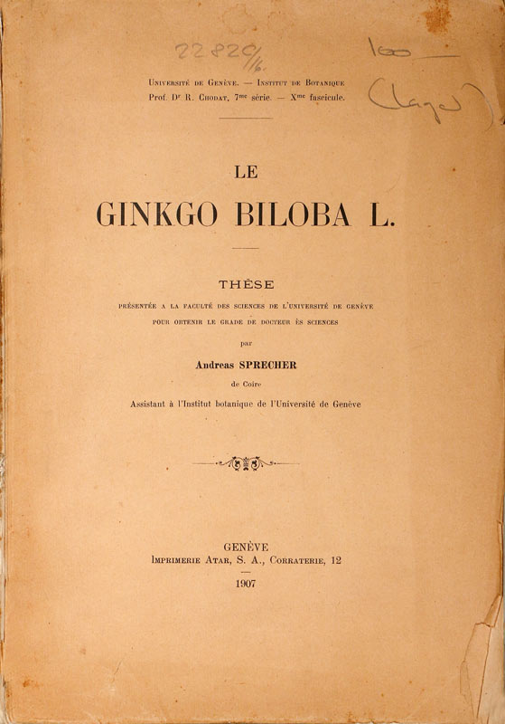 Sprecher, Andreas: Le Ginkgo biloba L. Genève, Atar, 1907. 207 S. Ill. Orig.-Broschur.
