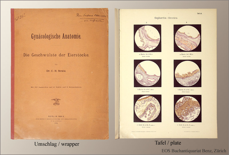 Stratz, C(arl) H(einrich): Die Geschwülste der Eierstöcke. Berlin, Fischer, 1894. 4°. (4) 40 S. Mit 3 Textholzschnitten und 50 lithogr. Abb. nach Aquarellen auf 14 Tafeln. Orig.-Broschur (leicht angestaubt). = “Gynäcologische Anatomie”, (2).