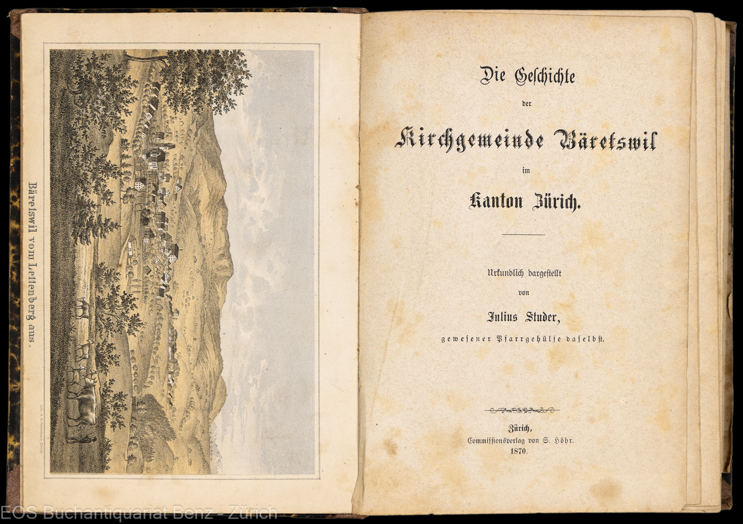 Studer, Julius: Die Geschichte der Kirchgemeinde Bäretswil im Kanton Zürich. Zürich, Commissionsverlag S. Höhr, 1870. 8°. XII, 280 S. 1 farb. Lithogr. (Bäretswil vom Lettenberg aus) und 1 lithogr. Karte von A.W. Fehrenbach.. Späterer Halbleinenband.