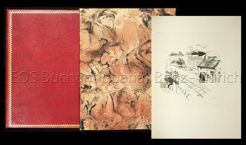 Tharaud, Jérôme und Jean: Les Hobereaux. Paris, Librairie Plon, 1943. 4°. (3) Bl., 46 S., (2) Bl. Mit 1 Titelvignette, 9 Radierung auf Tafeln und 9 radierte Anfangsvignetten von Daniel Rouvière (auf der Presse von Brunel). Roter Lederband der Zeti mit Innen-, Steh- und Aussenkantenvergoldung in Pappschuber von E. Schroth Basel.