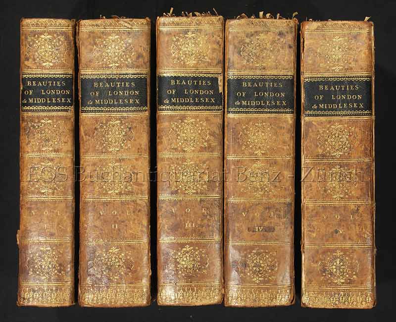 The Beauties of England and Wales or Delineations Topographical Historical and Descriptive. – London and Middleesex. London, Vernor, Hood and Sharpe, 1810-1816. 5 Bände (von 18). 8°. Mit 5 gest. Titeln und 134 Stahlstichtafeln. Lederbände der Zeit mit Rücken- und Deckelverg.