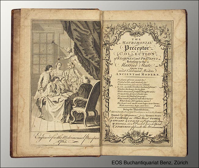 Marriage.- The Matrimonial Preceptor Collection – of examples and precepts relating to the married state from the moste celebrated writers ancient and modern. (London), printed by assignment from Thomas Hope for T. Lowndes (…) (1765). 12°. (2) 309 pp. (1) p. (of 3 pp. advertisements). With one engraved title and 1 engraved frontispiece. Contemporary leather (rubbed and bumped).