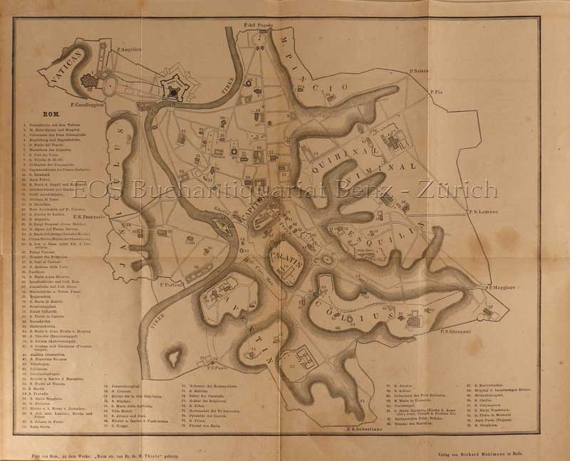 Thiele, Heinrich: Rom als Mittelpunct der katolischen Christenheit nach eigener Anschauung dargestellt. Halle, Richard Mühlmann, 1861. 8°. V, (3), 99 (1) S., (2) Bl. (Anzeigen). Mit 1 gef. Plan von Rom. Pappband der Zeit.