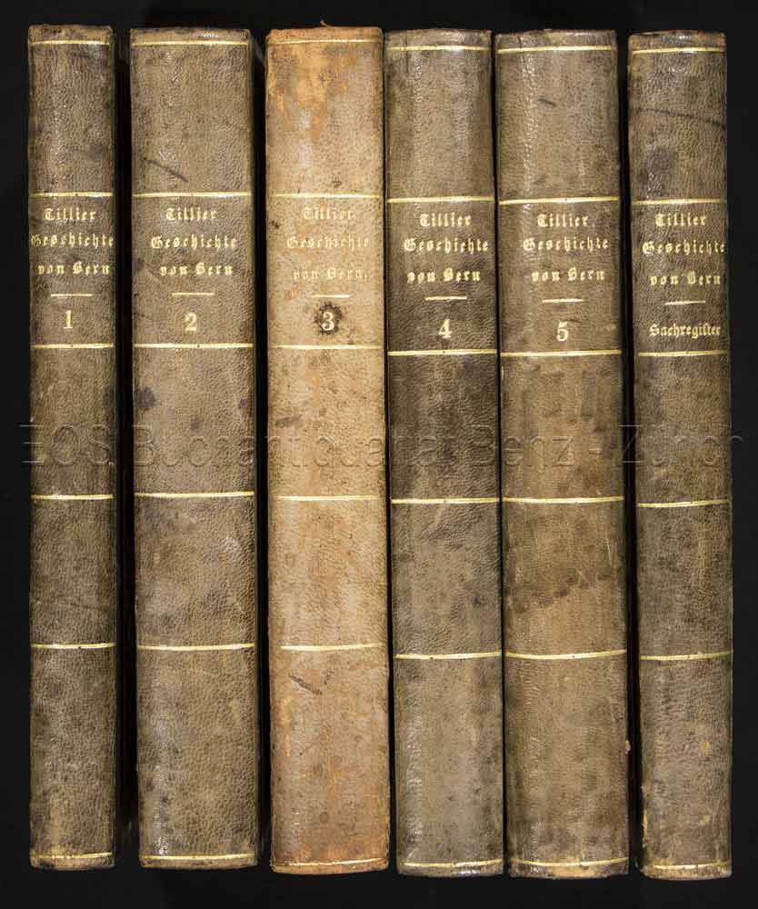 Tillier, Anton von: Geschichte des eidgenössischen Freistaates Bern von seinem Ursprunge bis zu seinem Untergange im Jahre 1798. Aus den Urquellen, vorzüglich aus den Staatsarchiven, dargestellt. Bern, Chr. Fischer, 1838–40. 5 Bände + 1 Registerband. 8°. Halblederbände der Zeit mit schlichter Rückenvergoldung.
