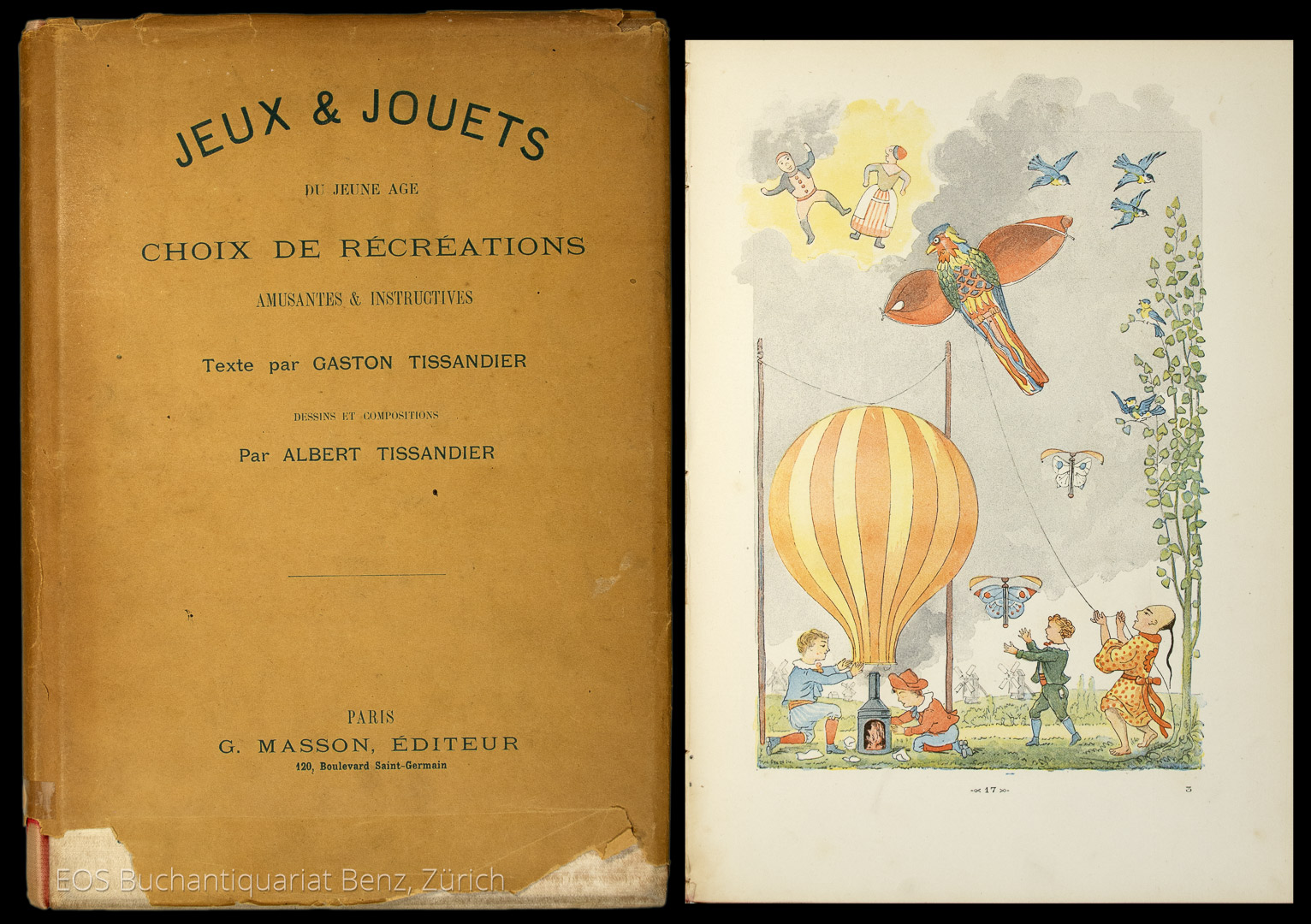 Tissandier, Gaston: Jeux et jouets du jeune âge. Choix de récréations amusantes & instructives. Texte par Gaston Tissandier ; dessins et compositions par Albert Tissandier. Paris, G. Masson, éditeur, (1884). 4°. 48 S. Mit farbigen Illustrationen von Albert Tissandier. Illustr. Orig.-Leinenband mit Schutzumschlag.