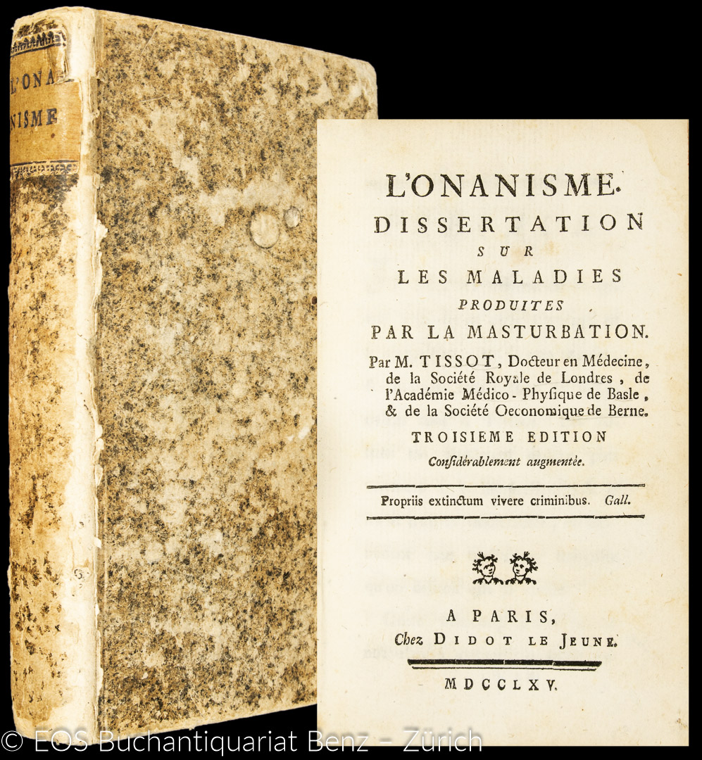 Tissot, Samuel Auguste: L’onanisme. Dissertation sur les maladies produites par la masturbation. Paris, Didot le Jeune, 1765. Troisième édition. Considérablement augmentée. 8°. XII, (2), 264 S. Pappband der Zeit mit Rückenschild.