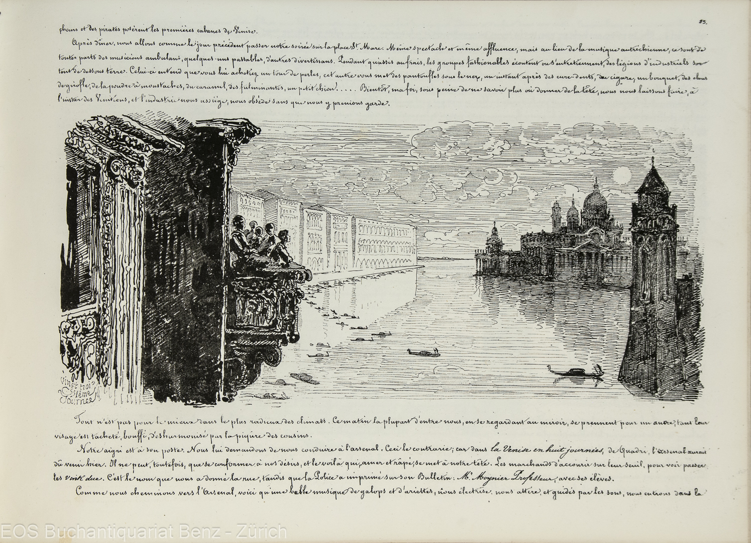Blondel 364. – Lonchamp 3011. – Carteret III, 592. – Erste Ausgabe. – Eine von zwei gleichzeitig gedruckten Varianten. – Die Reise nach Venedig, die am Mittwoch, dem 11. August 1841 begann und am 16. September endete, dauerte 36 Tage. An dieser Reise nahmen neben dem Ehepaar Töpffer, dessen Freund Moyner, 18 Schüler und David, der Diener, teil. Die Reise führte sie über das Berner Oberland, über die Pässe Grimsel, Furka und Julier, ins Engadin, über das Stilfserjoch nach Trient, Mestre und bis nach Venedig. – Auf dem Höhepunkt seiner künstlerischen Entwicklung reiste Töpffer zum ersten Mal so weit in den Süden Italiens. Seine Zeichnung des Canal Grande gilt laut Blondel als eines der besten Werke des Künstlers. – Ohne die Orig.–Umschläge. Mit einem grösseren und einigen kleineren mit Filmoplast hinterlegten Einrissen. Vereinzelte Stockflecken. Der Einband wenig berieben. (Sprache: Französisch / Français / French)