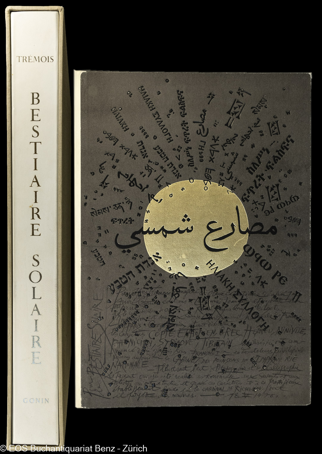Trémois, Pierre-Yves: Bestiaire solaire. Lausanne, André et Pierre Gonin, 1975. Folio. (4) Bl. (davon doppelseitiger illustrierter Titel), 10 illustrierte Doppelblätter, (4) Bl. (Register). Schwarz und Gold illustrierte Mappe in Leinenschuber.
