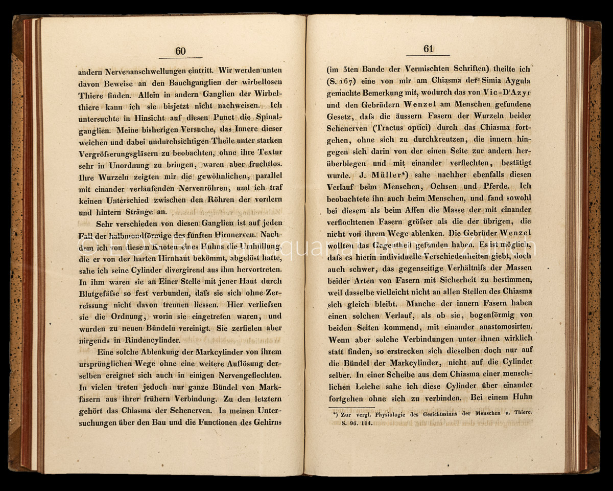 Treviranus, Gottfried Reinhold: Beiträge zur Aufklärung der Erscheinungen und Gesetze des organischen Lebens. (I:) Ueber die blättrige Textur der Crystalllinse des Auges als Grund des Vermögens, einerlei Gegenstand in verschiedener Entfernung deutlich zu sehen, und über den innern Bau der Retina. – (II:) Neue Untersuchungen über die organischen Elemente der thierischen Körper und deren Zusammensetzungen. – (III:) Resultate neuer Untersuchungen über die Theorie des Sehens und über den innern Bau der Netzhaut des Auges. Bremen, Georg Heyse, 1835-1837. 3 Bände in 1 Band. 8°. (2), 80, S., (1) S. (Druckfehler); 123 S., (1) S. (Inhaltsverzeichnis); XVI, (2), 109 S., (1) Bl. (Druckfehler). Mit 8 gest. Tafeln (davon 4 gefaltet). Orig.-Halblederband mit rotem Rückenschild und schlichter Rückenvergoldung.