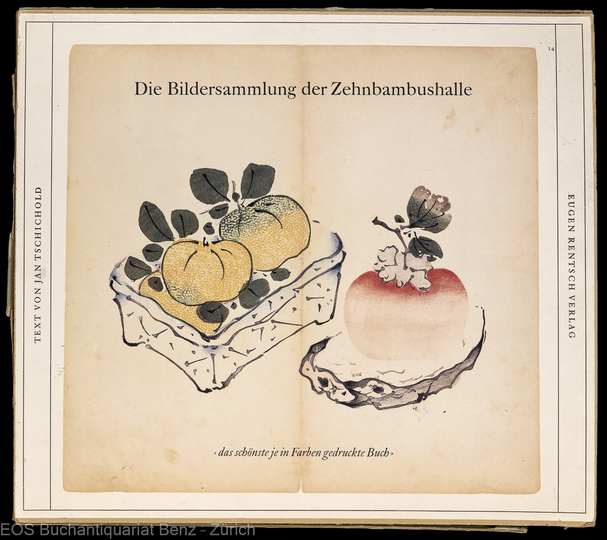 Tschichold, Jan: Die Bildersammlung der Zehnbambushalle. Von frühesten Abzügen aus dem Meisterwerk des chinesischen Farbendruckes der Mingzeit. Erlenbach-Zürich, E. Rentsch, 1970. 4°. 55 S., 24 farbige Tafeln. Beschrifteter Pappband in illustriertem Pappschuber.