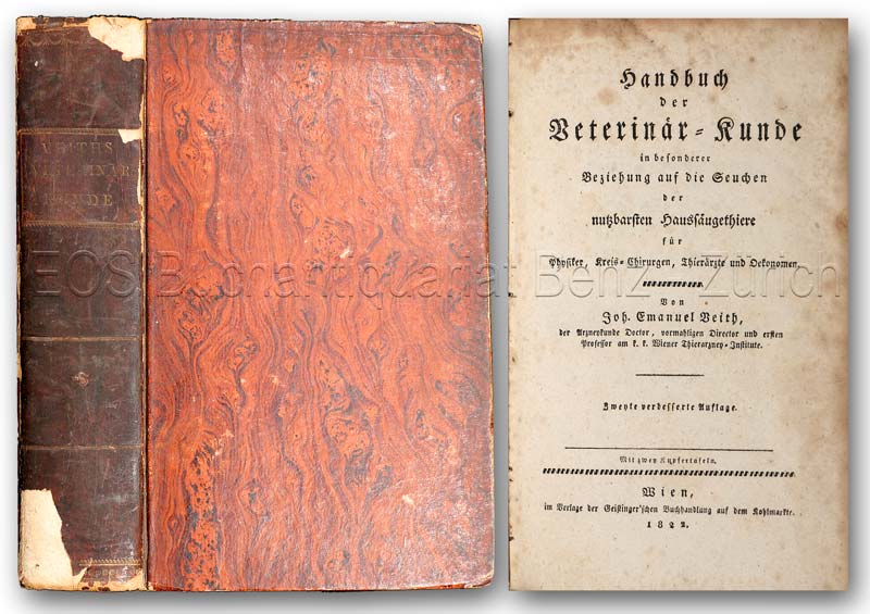 Veith, Johann Emanuel: Handbuch der Veterinär-Kunde in besonderer Beziehung auf die Seuchen der nutzbarsten Haussäugethiere für Physiker, Kreis-Chirurgen, Thierärzte und Oekonomen. Wien, Verlag Geistinger Buchhandlung, 1822. Zweite verbesserte Auflage. 8°. (12) Bl., 775 S., (1) Bl. Mit 2 gef. Kupfertafeln. Pappband der Zeit.