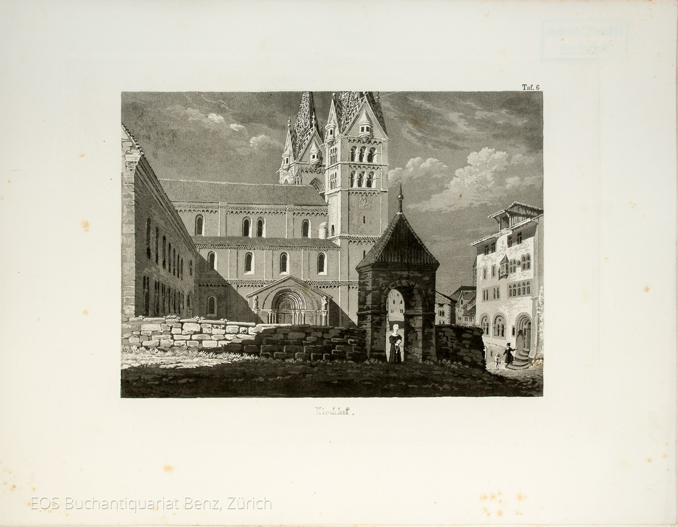 Barth 18516. – Dritte Ausgabe der erstmals 1831-1837 erschienen Sammlung von Aquatintatafeln zu Salomon Vögelins Werk «Das alte Zürich historisch-topographisch dargestellt. Oder eine Wanderung durch dasselbe im Jahr 1504», erschienen 1829. Gezeigt werden u. a. Ansichten beider Ufer der Limmat, das Rathaus, die Wasserkirche, die Predigerkirche, das Ötenbachkloster, das Barfüsserkloser, der Kirchhof beim Grossmünster, der St. Peter, der Münsterhof, der Weinplatz, die Papiermühle, das Fraumünster, das Schützenhaus sowie architektonische Details, Fresken und Skulpturen. – Durchgehend etwas stockfleckig. – Die Leinenbox berieben. Mit Geschenkeintrag von Frau Dekan Tester, Horn. 1924. Vorbesitzerstempel “Lehrerbibliothek Rorschach”. (Sprache: Deutsch / German)