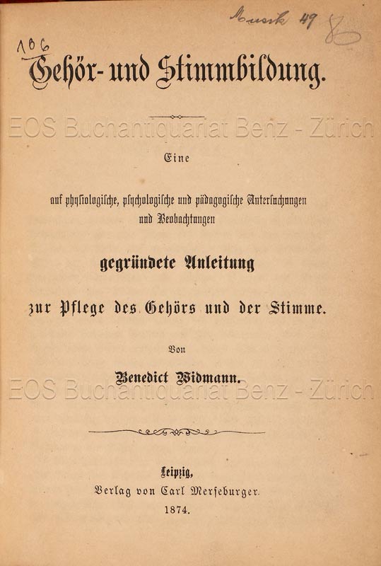 Widmann, Benedikt: Gehör- und Stimmbildung. Eine auf physiologische, psychologische und pädagogische Untersuchungen und Beobachtungen gegründete Anleitung zur Pflege des Gehörs und der Stimme. Leipzig, Merseburger, 1874. XII, 263 S. Mit einigen Notenbeispielen. Halblederband der Zeit.