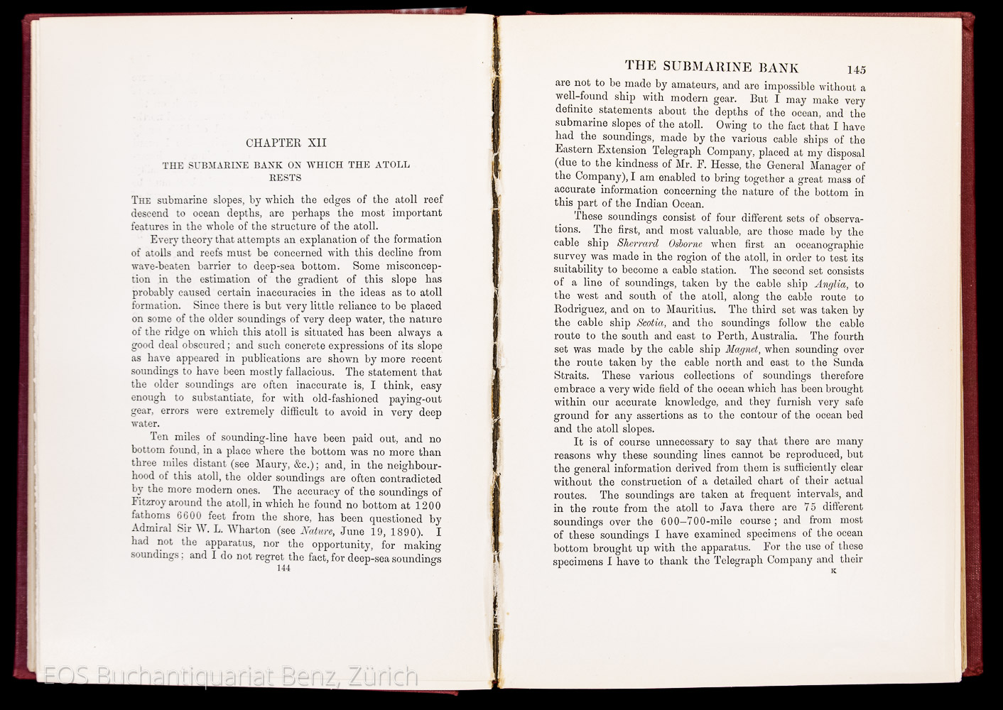 Wood, Jones Frederic; Coral and Atolls. their history, description, theories of their origin both before and since that of Darwin, the influence of winds, tides and ocean currents on their formation and transformations, their present condition, products, fauna and flora. London, Reeve, 1912. 8°. XXIII, 392 S. Mit zahlr. Karten, Tafeln und Abb. Orig.-Leinenband.