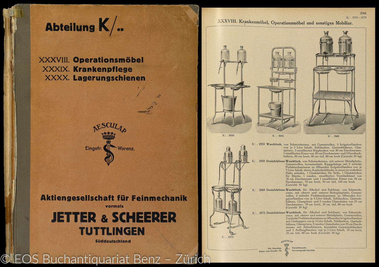 Abteilung K. XXXVIII. Krankenmöbel, Operationsmöbel und sonstiges Mobiliar; XXXIX. Artikel zur Krankenpflege, Eiterbecken usw.; XXXX. Lagerungsapparate und Schienen. Tuttlingen, Jetter & Scheerer, ca. 1910. 4°. Seiten 2701-2848. Mit zahlr. Abb. Orig.-Halbleinenband.