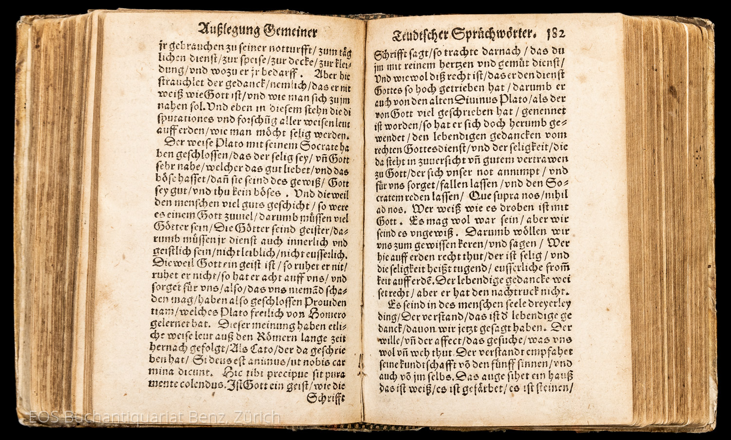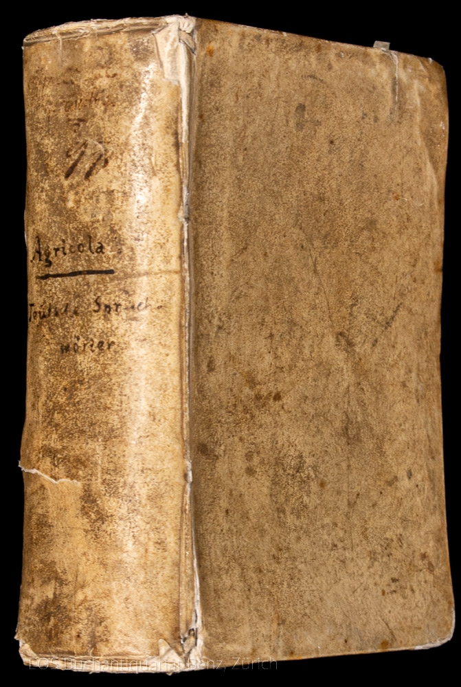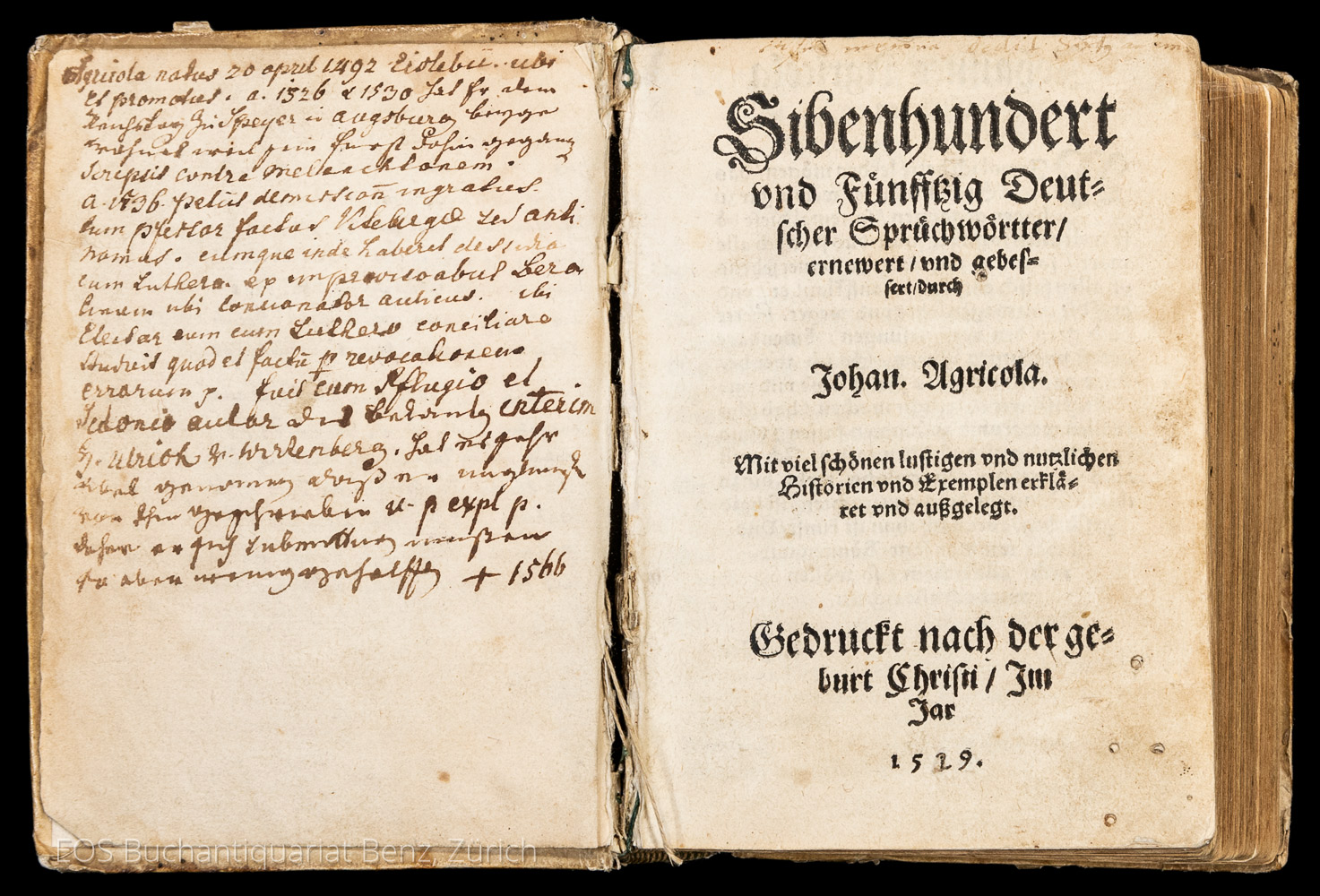 Agricola, Johannes: Sibenhundert und fünfftzig Deutscher Sprüchwörtter ernewert und gebessert durch Johan. Agricola. Mit viel schönen lustigen und nutzlichen Historien und Exemplen erkläret und ausgelegt. O.O., 15?9 (um 1560). Kl.-8°. (8) Bl., 410 (von 412) S. Pergamentband der Zeit.