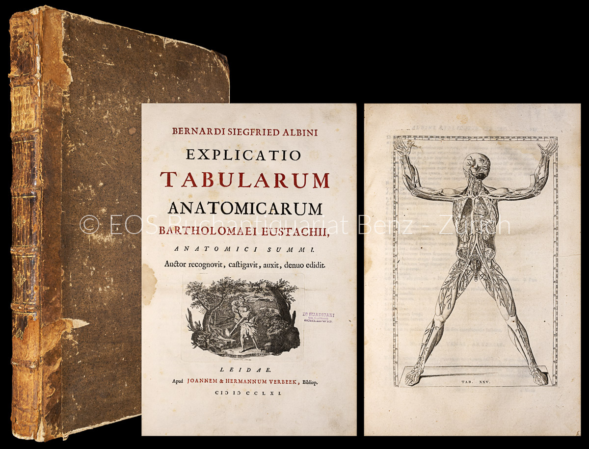 Blake 139. – Wellcome II, 26. – Zweite von Albinus bearbeitete und kommentierte Ausgabe der «Tabulae anatomica» von Eustachius. Hier zum zweiten Mal mit den Umrissradierungen gegenüber den Kupferstichen. Die Nummerierung und Alphabetisierung der anatomischen Abbildungen wurde 1734 von Albinus in Zusammenarbeit mit seinem Graphiker J. Wandelaar erstmals angewendet. – Einband stark bestossen und berieben. Lederbezug am Rücken und am Deckel stellenweise abgeplatzt. In der oberen rechten Ecke mit durchgehendem Wasserrand. Leichte Feuchtigkeitsspuren im Innenfalz. Eine Tafel stark angerändert und mit mehreren Einrissen ausserhalb der Darstellung. Titel gestempelt «Karl Ferdinand Suadicani» (siehe Hirsch V, 576). – Résumé: Second edition arranged and commented by Albinus. This edition with line etching opposite the copper-plate engravings in cooperation with the artist J. Wandelaar. With 89 copper-plates. Contemporary half calf ( leather cover detachments, rubbed and bumped). 1 plate with tears. Title stamped «Karl Ferdinand Suadicani» (Hirsch V, 576). (Sprache: Lateinisch / Latin)