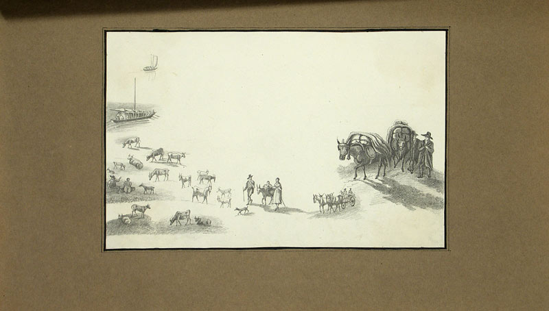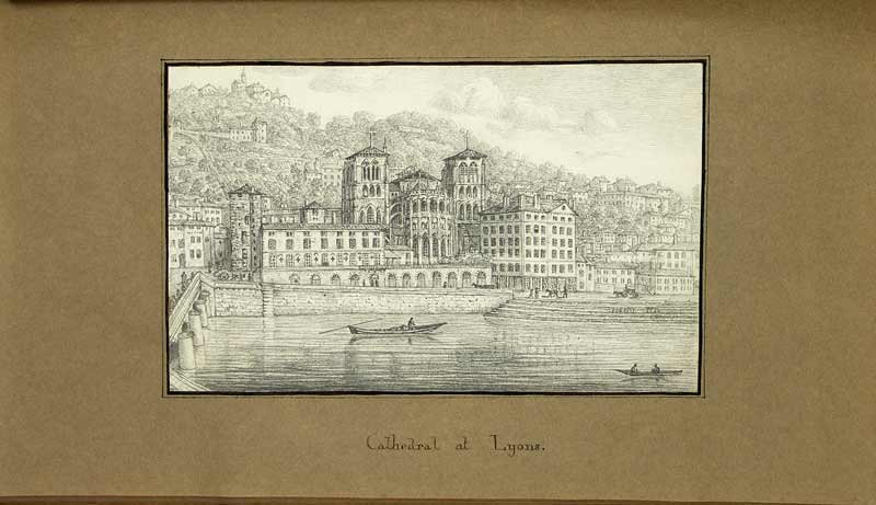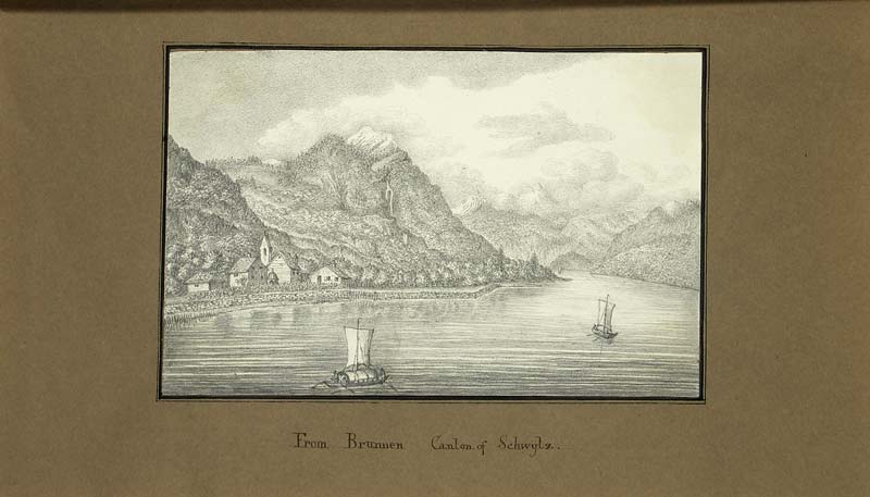 Privates Erinnerungsbuch an eine typische Bildungsreise eines Englischen Touristen auf dem Kontinent. Die Reise führte durch die Spanien, Frankriech, Italien und die Schweiz. Dreiundzwanzig der durchaus ansprechenden Ansichten sind (fast alle) mit brauner Tinte auf dem Unterlageblatt bezeichnet. Sie zeigen z.B. „View from a garden at Pau, From the villa Pliniana on lake of Como, San Sebastian from recollection, From Brunnen Canton of Schwytz, The Pont du Gard“, etc. Drei Blätter im selben Stil liegen lose bei, eines ist verso mit Bleistift bezeichnet „Cornisch“, eines „Wesen“, und eines ohne Bezeichnung. Ebenfalls eingeklebt sind vier Blätter mit Figuren, unbezeichnet, zum Teil laviert. – Erstes Unterlageblatt etwas lose, Einband berieben.