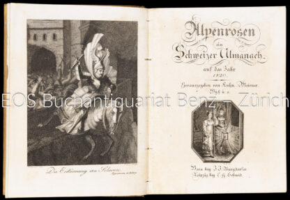 Alpenrosen. Ein Schweizer Almanach auf das Jahr 1820. Hrsg. von Kuhn, Meisner, Wyss et al. Bern u. Leipzig, Burgdorfer u. Schmid, 1820. 12°. (2) 388 S., (4) S. Mit 7 gest. Taf., dv. 4 gef., und 2 gef. Notenbl. Illustr. Orig.-Pappband in Schuber.