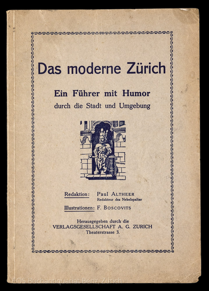 Altheer, Paul: Das moderne Zürich. Ein Führer mit Humor durch die Stadt und Umgebung. Zürich, Verlagsgesellschaft, (1925). 8°. 77 S. Mit Illustr. im Text. Orig.-Broschur.