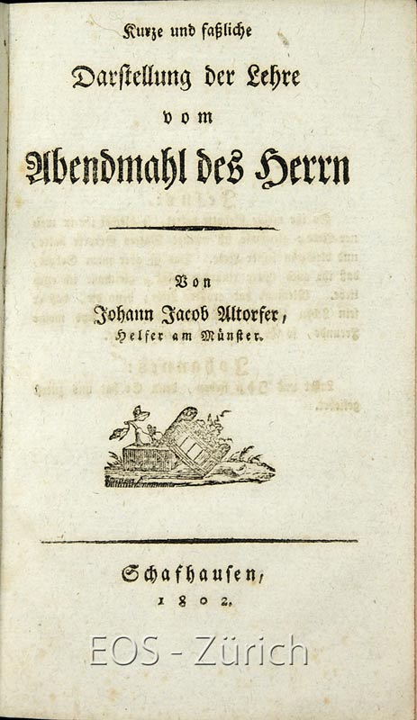 Vgl. HBLS I, S. 301. Kleine Schrift von Johann Jakob Altorfer (1754-1829), Diakon, Professor der Theologie, Kirchen- und Schulrat. Mit eh. Gedicht des Verfassers auf Vorsatz, gewidmet „Seiner bisherigen Schülerin im Religionsunterricht, Anna Elisabeth Habicht, zum Andenken … 1808“.