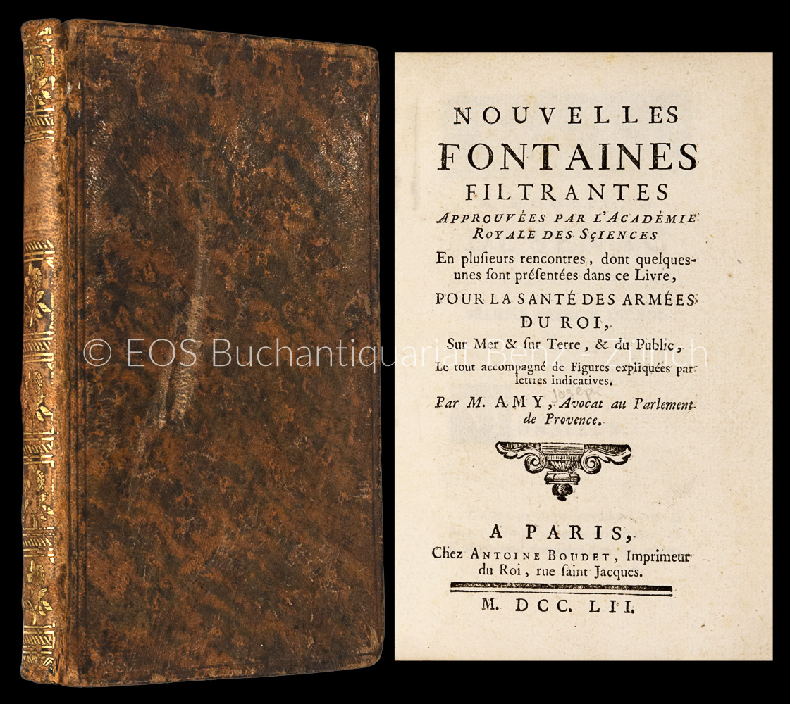 Amy, Joseph: Nouvelles fontaines filtrantes. Approuvées Par L’Académie Royale des Sciences en plusieurs rencontres, dont quelquesunes sont présentées dans ce livre, pour la santé des armées du roi, sur mer & sur terre, & du public, le tout accompagné de figures expliquées par lettres indicatives. Paris, Antoine Boudet, 1752. 2 Teile in 1 Band. Kl.-8°. VIII, 71 S.; 46 S. Mit 7 (davon 6 gef.) Tafeln und 6 Textholzschn. Lederband aus der Zeit mit Rückenvergoldung.