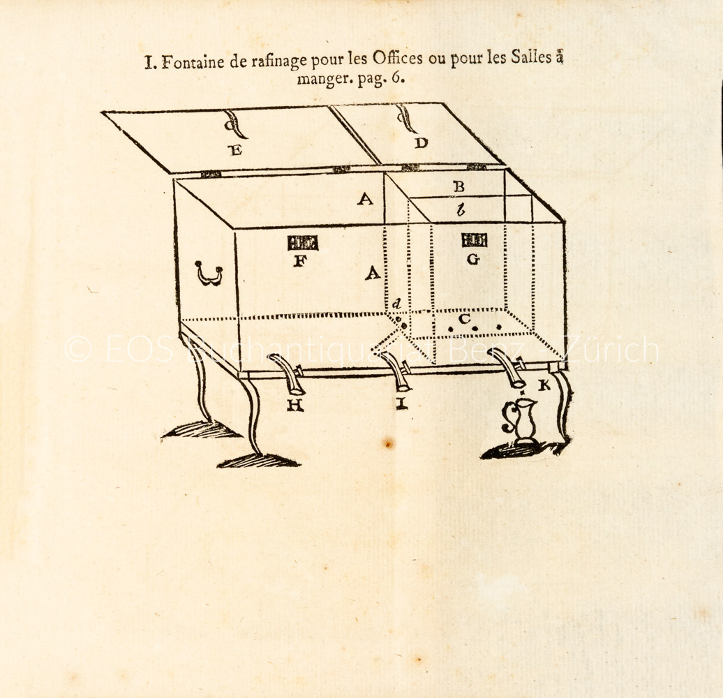 Mit der Überschrift «Fontaine de poche» für den zweiten Teil. – Sehr seltenes und frühes Werk über Trinkwasseraufbereitung. – Papier nur vereinzelt etwas gebräunt. Der Einband berieben und bestossen. (Sprache: Französisch / Français / French)