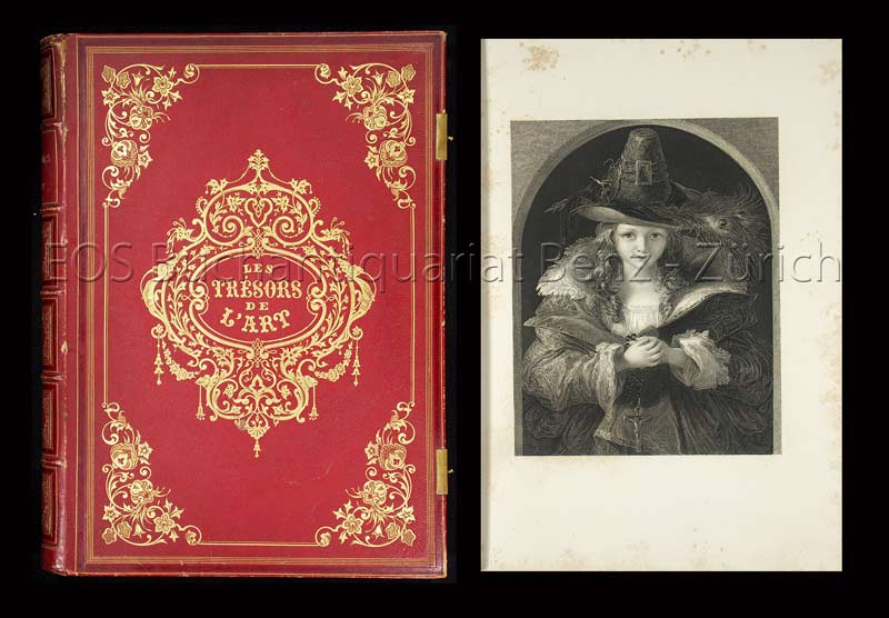 Armengaud, J(ean) G(ermain) D(ésiré):  Les trésors de l’art. Paris, Ch. Lahure, 1859. 4°. 1 gest. Titelvignette und 46 Tafeln mit je 2 Seiten Text. Lederband der Zeit mit Rücken- und Deckelvergoldung sowie 1 (von 2) Metallschliessen.