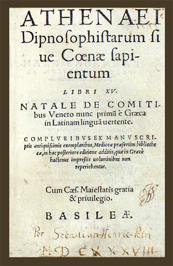 Athenaeus: Dipnosophistarum sive Coenae sapientum Libri XV / Natale de comitibus Veneto nunc primu[m] è graeca in latinam lingua(m) vertente. Compluribus ex manuscriptis antiquissimis exemplaribus, … in hac posteriore editione additis, quae in graecè hactenus impressis voluminibus non reperiebantur. Basel, (Henri Petri, August 1556) 8°. (26) Bl., 1122 S. Pappband um 1820 mit rotem goldgeprägtem Rückentitel.