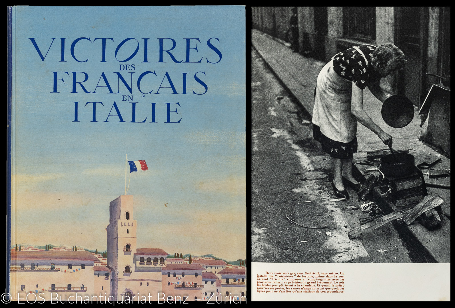 Babelay, Jean-Louis, Eparvier, Jean Victoires des Français en Italie. – Un An – A Paris. Sous la botte des Nazis. Eparvier, Jean: A Paris sous la botte des Nazis. Paris, Editions Raymond Schall 1946. 3 Bände. 4°. Mit Fotografien von Pappbände in Schuber.