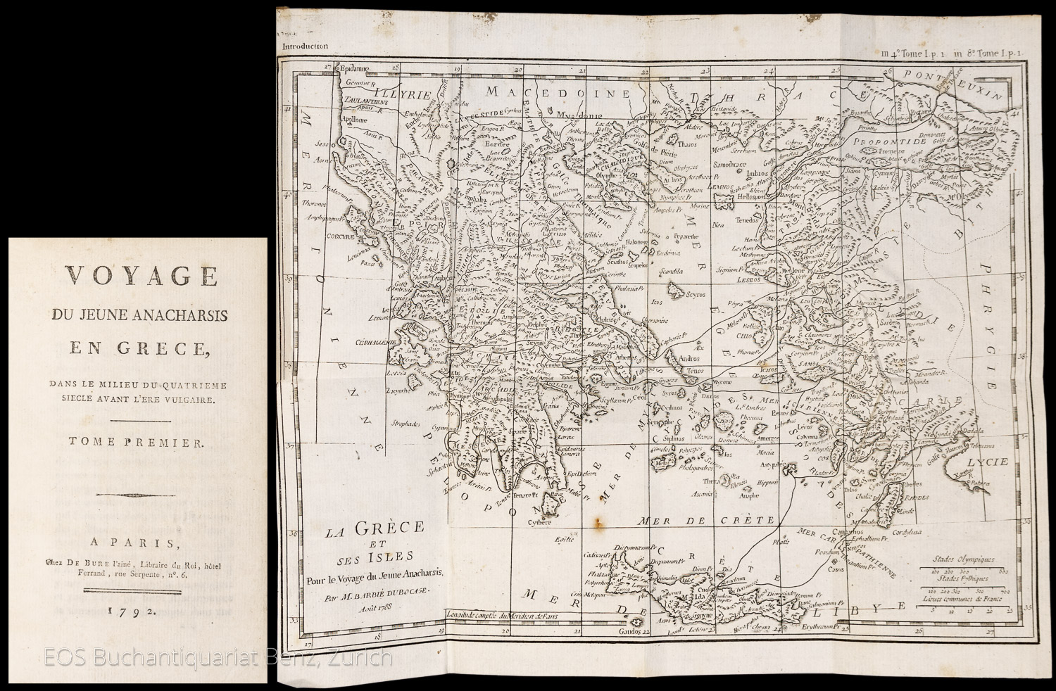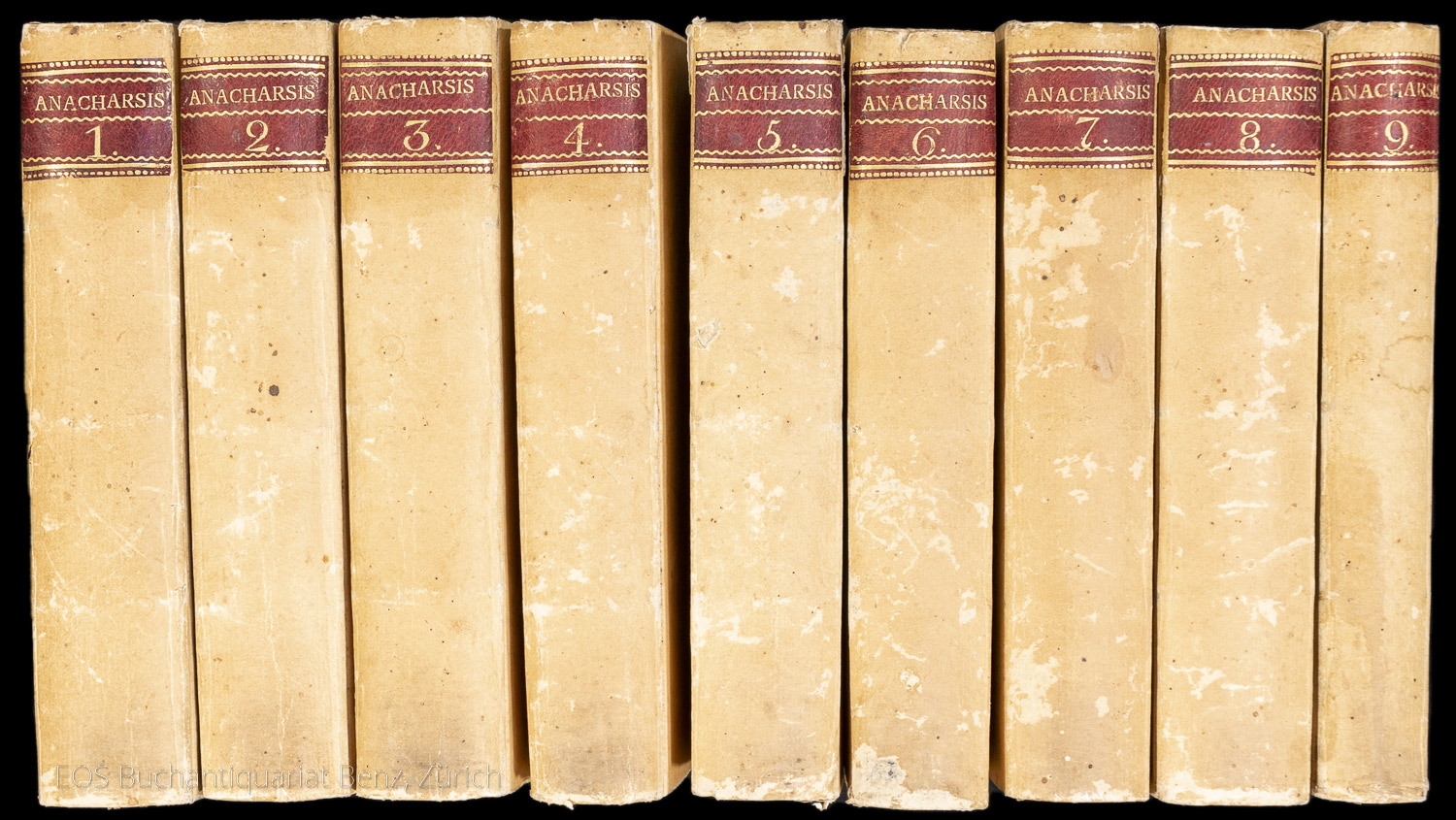 Barthélemy, Jean-Jacques: Voyage du jeune Anacharsis en Grèce. Paris, De Bure, 1792. 9 Bände. Mit einer gef. Karte. Pappbände der Zeit mit roten Rückensch.