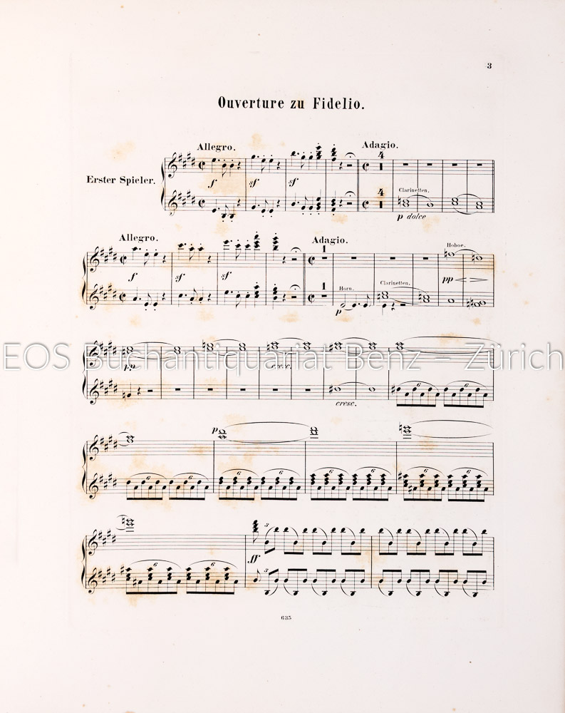 Platten-Nr. 635. – Prachtausgabe zum 100. Geburtstag Beethovens. Mit zweisprachigem Vorwort. Der Librettotext in Deutsch den Noten vorgebunden nach dem Französischen bearbeitet von Joseph Sonnleitner und Friedrich Treitschke. Enthält beide Ouvertüren (zu vier Händen) sowohl zu Fidelio als auch zu Leonore. Es folgt der Klavierauszug für zwei Hände mit französisch-deutschem Paralleltext. – Papier vereinzelt etwas stockfleckig. Einband leicht berieben und bestossen. Durchgehend leicht fleckig. (Sprache: Deutsch / German – Français / French – English)