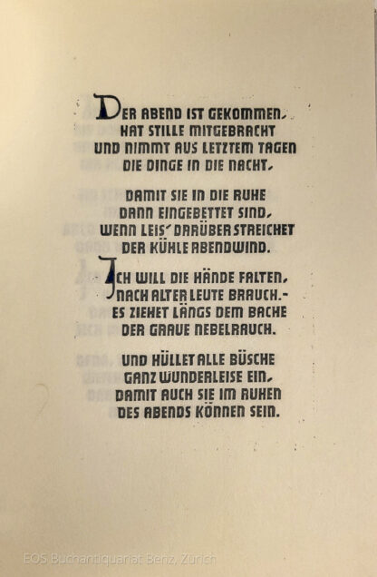 Bergmann, Max Eugen (M.Oe.[d.i. Max Oechslin]): Der Abend ist gekommen. Als Manuskript gedruckt. Altorf-Uri u. St. Moritz, o. Vlg., 1965. Gr.-8°. (59) S. Text in Holz geschnitten von Gottfried Grieshaber. Mit kolorierten Initialen. Orig.-Blockbuch (leicht angestaubt, vord. Deckel mit blassem Fleck).