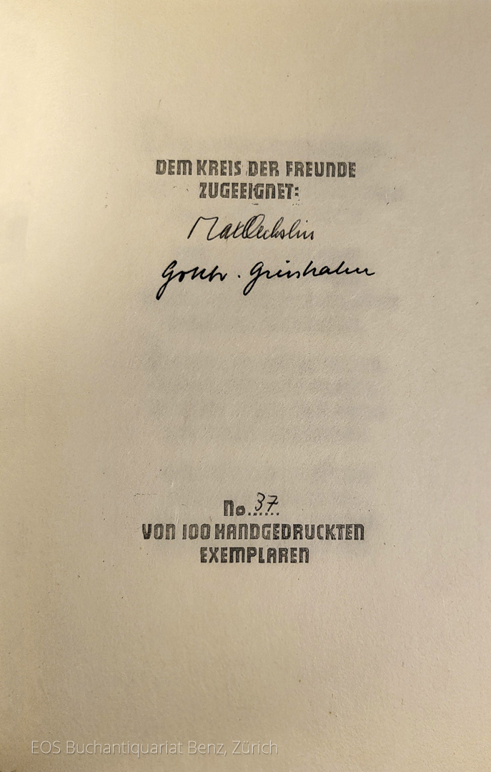 Nr. 37 von 100 Ex. Von Max Oechslin u. Gottfried Grieshaber signiert. Mit einer Widmung in Blei on Max Oechslin an Karl Iten auf dem fl. Vorsatz u. einer beiliegenden Danksagungskarte mit dem Portrait von Max Oechslin, die von dessen Sohn an Karl Iten gerichtet ist. – Karl Iten war Grafiker, freischaffender Künstler, Ausstellungsmacher und Konservator des Historischen Museums Uri.