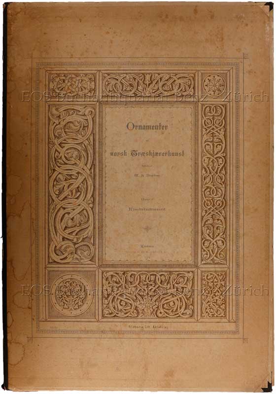 Bergstrøm, W. S. (William S.): Ornamenter for norsk Traeskjaererkunst. Tegnede at W.S.B. Kristiania, Aschehong, 1886. 2 lithogr. Titelblätter und 15 lithogr. Tafeln. Lose in Orig.-Mappe mit defektem Leinenrücken.