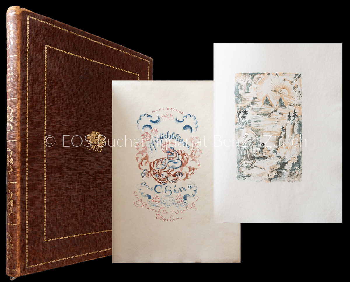 Bethge, Hans: Pfirsichblüten aus China. Nachdichtungen chinesischer Lyrik. Berlin, Rowohlt, 1920. Folio. 97 S. Mit lithogr. Titel und 10 Lithographien von Bernhard Hasler. Orig.-Lederband mit Rücken- und Deckelvergoldung sowie Kopfgoldschnitt.