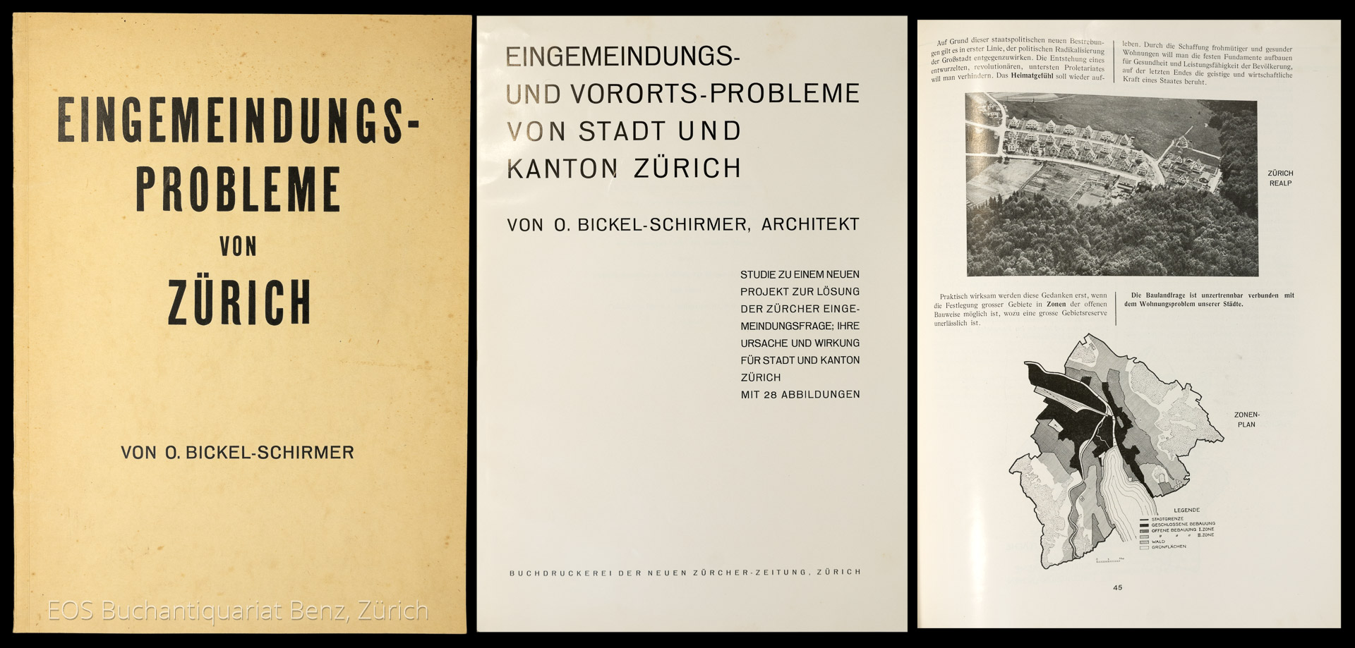 Bickel-Schirmer, O.:  Eingemeindungs- und Vororts-Probleme von Stadt und Kanton Zürich. Studie zu einem neuen Projekt zur Lösung der Zürcher Eingemeindungsfrage; ihre Ursache und Wirkung für Stadt und Kanton Zürich. Zürich, Buchdruckerei der neuen Zürcher-Zeitung, (1930). Folio. 72 S. Mit 28 Abb. im Text. Orig.-Broschur.