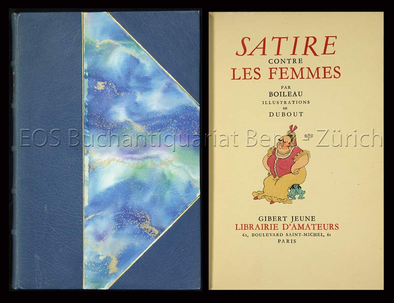 Dubout.- Boileau(-Despréaux, Nicolas): Satire contre les femmes. Paris, Gibert Jeune, Librairie d’amateurs, 1944. 8°. 43 (4) S. Mit 29 farb. Illustr. von Dubout. Sign. Halblederband (L. Nabholz, Zürich).