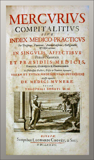 Bonet, Théophile: Mercurius compitalitius sive index medico-practicus. Per decisiones, cautiones, animadversiones, castigationes & observationes in singulis affectibus praeter naturam et praesidiis medicis, diaeteticis, chirurgicis & pharmaceuticis ex probatissimis practicis, pricis & neotericis depromptas veram et tutam medendi viam ostendens. Accessit appendix de medici munere. Genève, Leonard Chouët, 1682. Folio. (12) Bl., 987 S., (15) S. Index. Mit einer gest. Titelvignette. Pergamentband aus der Zeit.