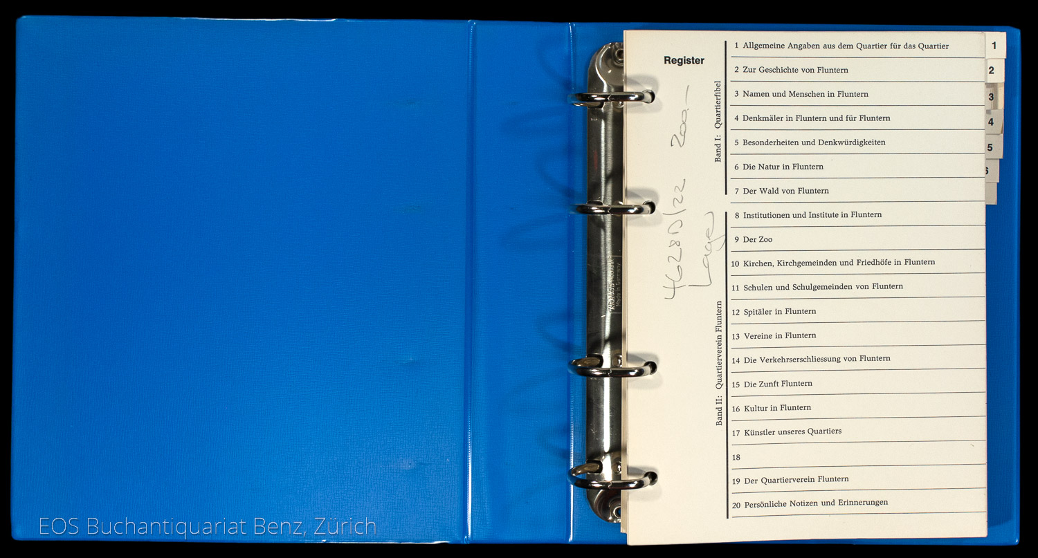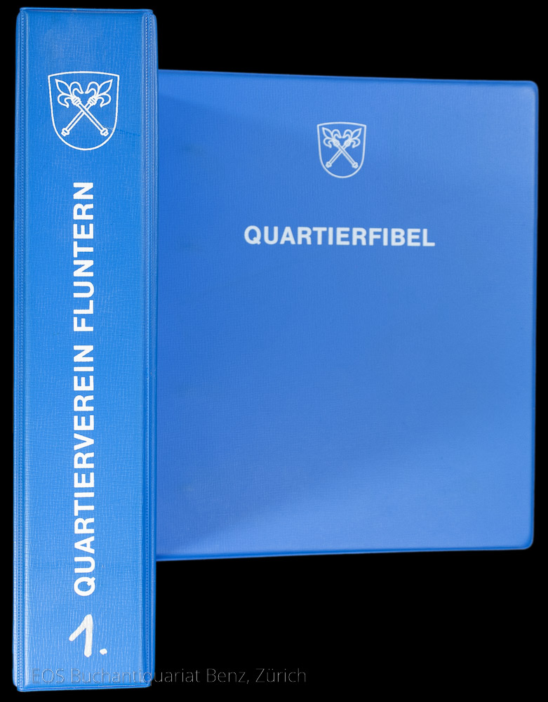 Die Quartierfibel, resp. Chronik enthält 20 Register: 1. Allgemeinen Angaben aus dem Quartier für das Quartier, 2. Zur Geschichte, 3. Namen und Menschen, 4. Denkmäler in Fluntern und für Fluntern, 5. Besonderheiten von Denkwürdigkeiten, 6. Die Natur, 7. Der Wald, 8. Institutionen und Institute, 9. Der Zoo, 10. Kirchen, Kirchgemeinden und Friedhöfe, 11. Schulen und Schulgemeinden, 12. Spitäler, 13. Vereine, 14. Die Verkehrserschliessung, 15. Die Zunft, 16. Kultur, 17. Künstler unseres Quartiers, 18. (leer), 19. Der Quartierverein, 20. Persönliche Notizen und Erinnerungen. (Sprache: Deutsch / German)