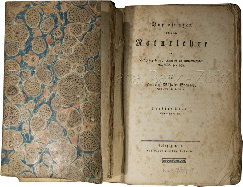 Brandes, Heinrich Wilhelm: Vorlesungen über die Naturlehre, zur Belehrung derer, denen es an mathematischen Vorkenntnissen fehlt. Leipzig, Göschen, 1830–1831. 2 Bände von 3. 8°. Mit 9 gef. Kupfertafeln. Interims-Marmorpapier-Umschläge.