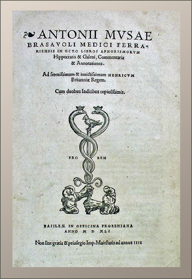Brasavola, Antonio Musa: In octo libros aphorismorum Hippocratis & Galeni commentaria & annotationes. Basel, Froben, 1541. Kl.-folio. 4 n.n. Bl., 1145 S., 1 weisses Bl., 74 n.n. Bl. Mit gestochener Druckermarke auf dem Titel und dem letzten Blatt und 2 kleinen Holzschnitten im Text. Halbpergamentband der Zeit mit goldgeprägtem Rückenschild.