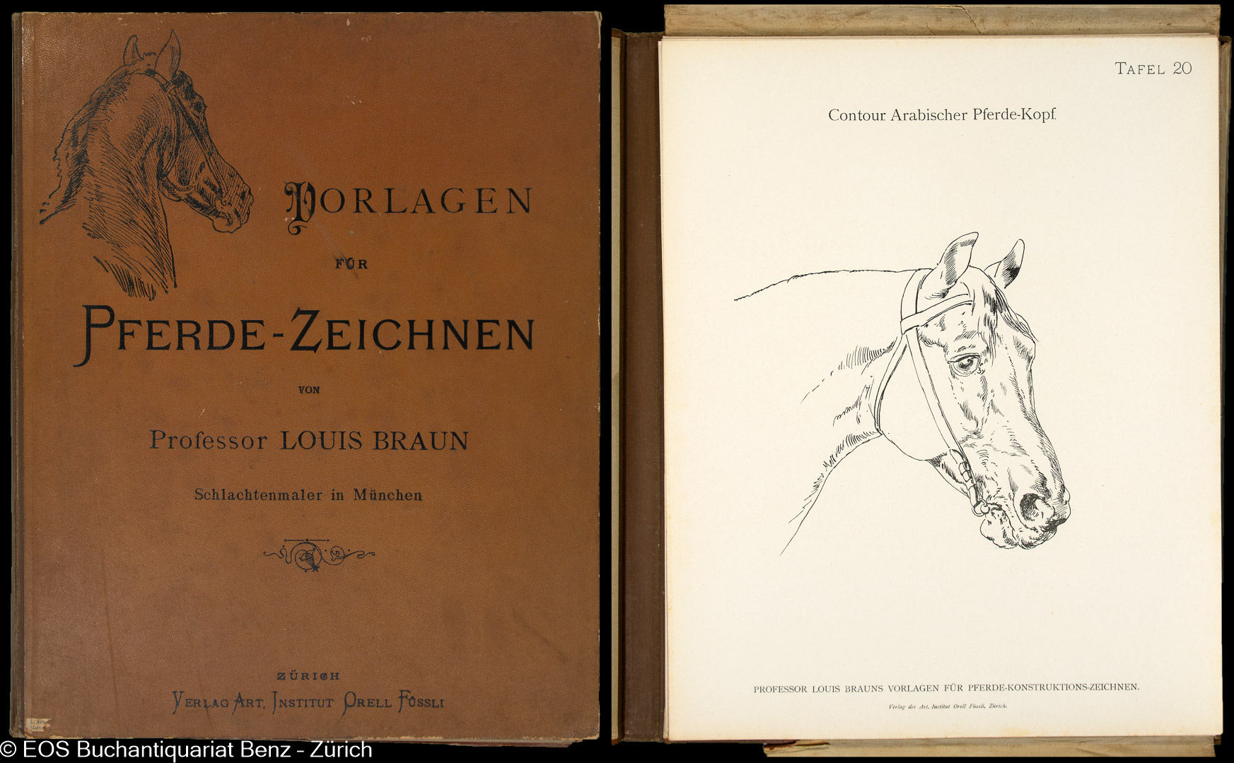 Braun, Louis:  Vorlagen für Pferde-Konstruktionszeichnungen. Von Louis Braun, Schlachtenmaler in München. Für Bildhauer, Kunstschulen, Veterinärschulen, Dilettanten und Pferdeliebhaber. Zürich, Verlag des Art. Institut Orell Füssli, 1893. 2°. Titelblatt. Mit 48 (davon 4 farb.) Tafeln. Orig.-Leinenmappe.