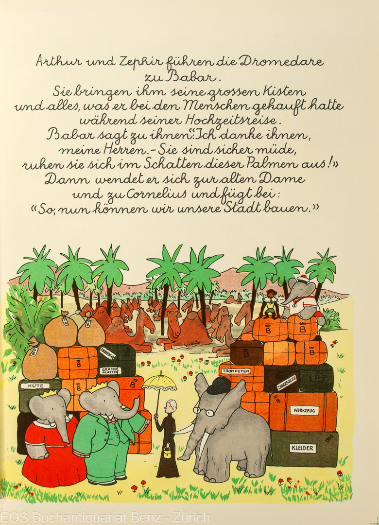 Doderer I, 211. – Erste deutsche Ausgabe. Erschien erstmals 1939 bei Hachette in Paris. Jean de Brunhoff (1899-1937) verstarb an einem Lungenleiden bevor sein erstes Buch publiziert wurde. Seine Frau, die Pianistin C. Sabourand erfand die kleine Elefantenfigur «Babar». «Aus der Kinderstube der B.s entwickelte sich die Geschichte, die als Bilderbuchserie internationalen Ruhm erlangte» (Doderer). In der Folge wurden die Kinderbücher von seinem Bruder Michel und seinem Sohn Laurent herausgegeben. Sein Sohn versuchte die Erfolgsserie mit weiteren Babargeschichten fortzusetzen. – In perfektem neuwertigem Zustand. (Sprache: Deutsch / German)