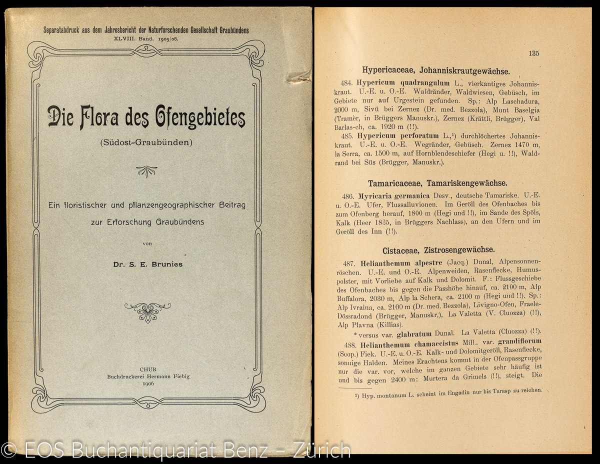Brunies, Stefan: Die Flora des Ofengebietes (Südost-Graubünden) – Ein floristischer und pflanzengeographischer Beitrag zur Erforschung Graubündens. Chur, Hermann Fiebig’s Buchdruckerei, 1906. 4°. 326 S. Mit 4 Tafeln und 1 gef. Karte. Original-Broschur.