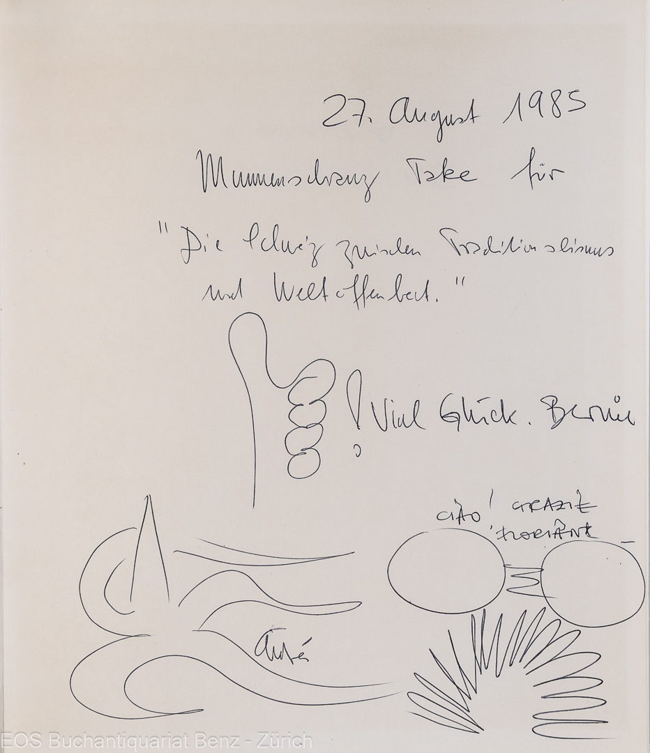Mit ganzseitiger Widmung und Zeichnungen in Kugelschreiber: «27. August 1985 – Mummenschanz Take für „Die Schweiz zwischen Traditionismus und Weltoffenheit». Signiert von André Bossard, Bernie Schurch und Floriana Frassetto. – Gut erhaltenes Exeplar. (Sprache: Französisch / Français / French)