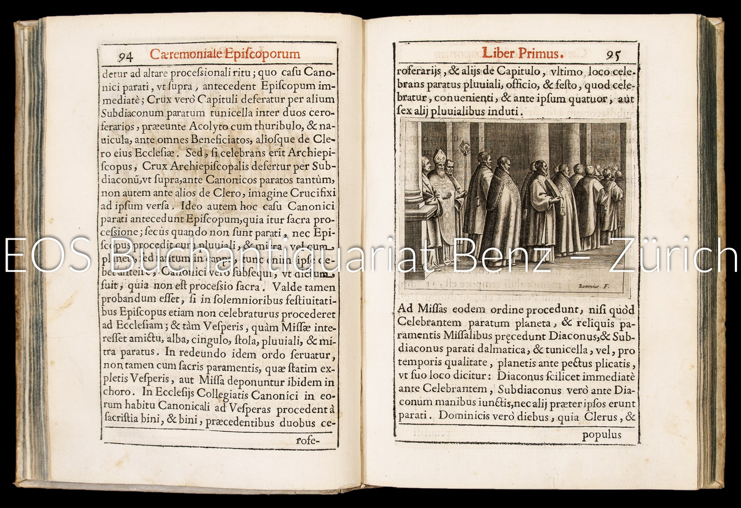 Cæremoniale Episcoporvm Clementi VIII. Primvm Nvnc Denvo Innocentii Papæ X. Actoritate Recognitvm. Omnibus Ecclesijs, præcipuè autem Patriarchalibus, Metropolitanis, Cathedralibus, & Collegiatis perutile, ac necessarium. Romae, Typis Rev. Camerae Apostolicae, 1651. 4°. (7) Bl., 408 S. Mit gest. Titel, 67 Textkupfern und über 13 Seiten Notenbeispiele. Pergamentband der Zeit.